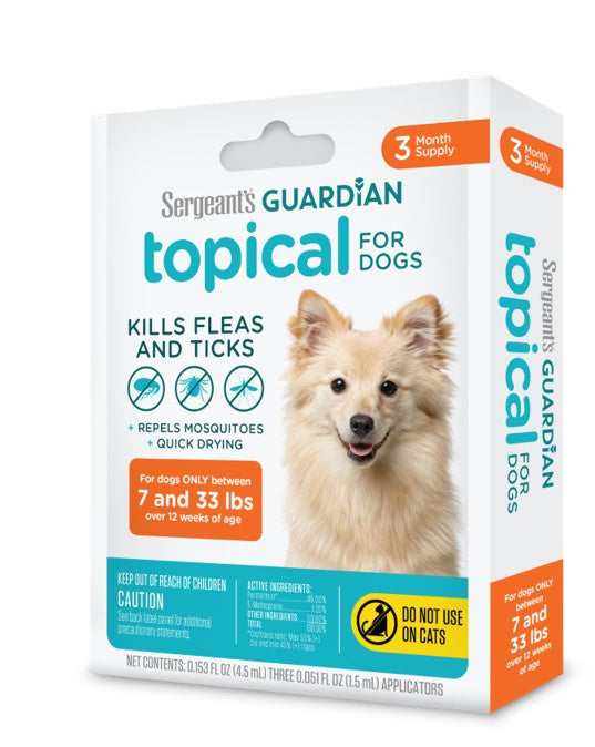 Sergeants Guardian Topical is a flea and tick prevention for dogs that kills fleas and ticks plus repels moquitoes for up to 4 weeks.