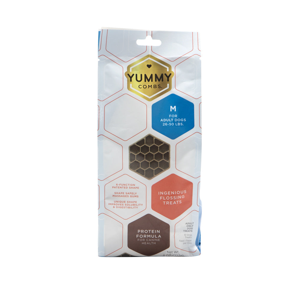 Shape Makes The Difference: A New Generation of Dog Treats with a Uniquely Patented Shape and thin wall design deters gulping, flosses between teeth, cleans to the gum line, highly digestible, dissolves rapidly and preserves health supporting nutrients by way of low temperature processing. It is complete and balanced, all natural, gluten free, grain free; it contains 44% high quality animal protein with all amino acids. Yummy Combs contains 12 specific wellness ingredients for your pet's best life.
