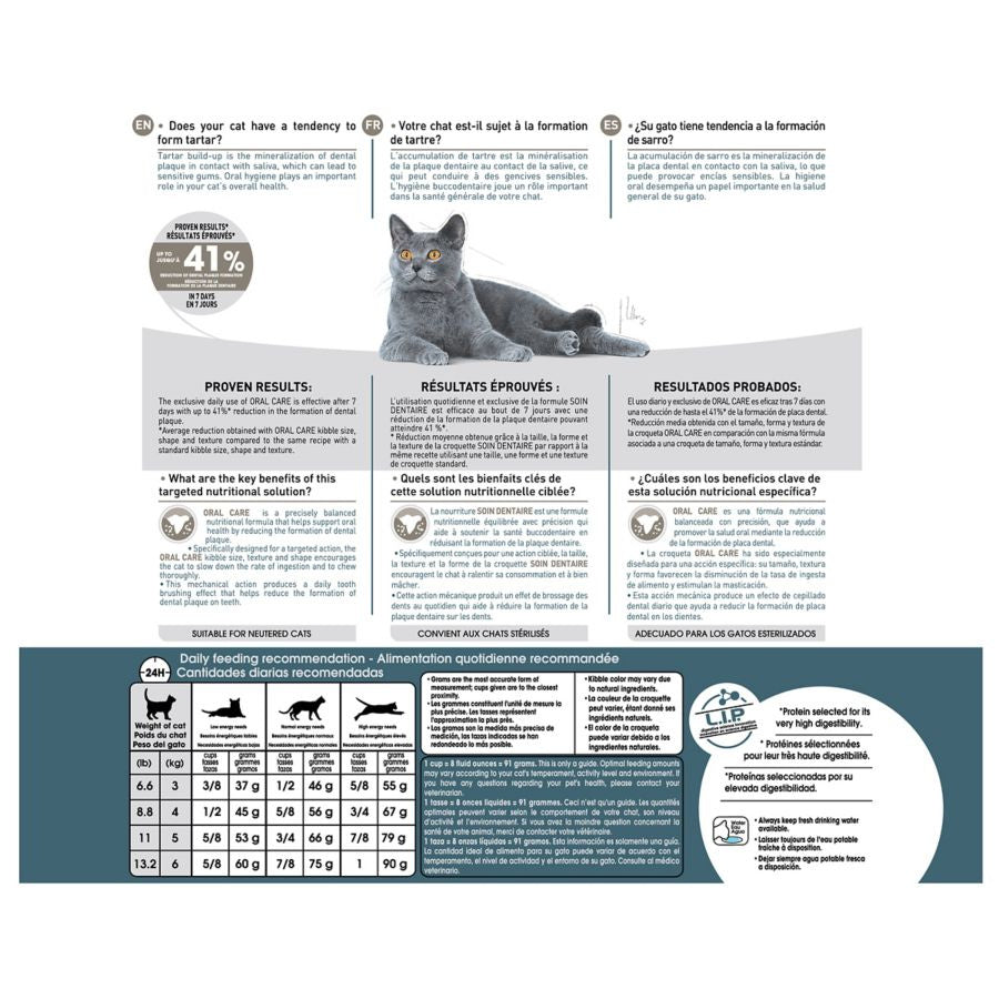 Royal Canin Oral Care dry cat food is made to support the dental health of your cat. This targeted diet is formulated to support your cat’s oral health, keeping plaque and tartar in check—and has been proven to reduce dental plaque by 41% after 7 days of exclusive feeding.* Its exclusive cat kibble encourages chewing with a unique texture and shape that simulates tooth-brushing as they crunch away. Stick to a dry food diet to help support continued oral health. Because feline dental care can be complicated and often hard to assess, consult your veterinarian if you are concerned about your cat's oral health.