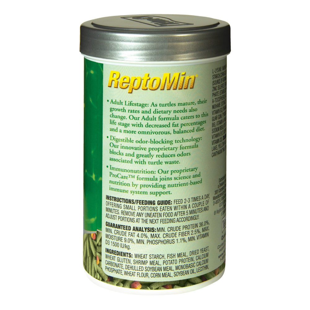 As turtles grow and age, they require specific dietary needs. Tetrafaunas ReptoMin PRO Adult Formula is specifically designed to provide adult turtles, whose shells measure over five inches, with a balanced diet. These tasty sticks are crafted with lower fat percentages and align with a more omnivorous-balanced diet thats rich in protein and contains vitamin D3. This floating food also has an odor blocking property that helps reduce the stink of your turtles waste. Tetrafaunas ReptoMin PRO Adult Formula helps support your BFFs immune system with nutrients and has the flavor and aroma hell love!