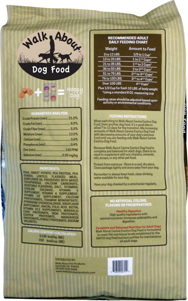 Walk About Canine Exotics Vegan Recipe Grain-Free Dry Dog Food! This tasty kibble is made with real vegetables including peas, sweet potatoes and lentils, providing your pup with the wholesome nutrition he deserves! Made with no meat or dairy, this vegan recipe is also grain-free making it paw-sitively perfect for furry friends with sensitivities to grains!