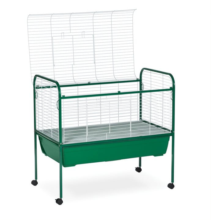 Prevue Pet Products Small Animal Cage 320 with Stand is ideal for a variety of small animals including rabbits and guinea pigs. Two large doors, one on the top and one on the side, allow you to easily access your precious pet. Tubular steel stand sits on casters so cage can easily be moved from room to room or even from indoors to outdoors. Non-toxic powder coated finish cleans up quickly while the extra deep 6-1/2 plastic pan contains mess. Our Small Animal Cage with Stand is Green with White mesh and measures 29 long, 19 wide, 31 high with 1 wire spacing.