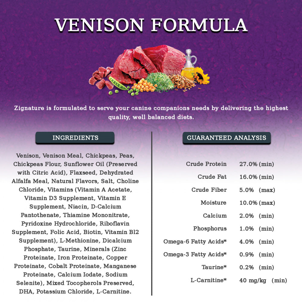 Venison, Venison Meal, Chickpeas, Peas, Chickpeas Flour, Sunflower Oil (Preserved with Citric Acid), Flaxseed, Dehydrated Alfalfa Meal, Natural Flavors, Salt, Choline Chloride, Vitamins (Vitamin A Acetate, Vitamin D3 Supplement, Vitamin E Supplement, Niacin, D-Calcium Pantothenate, Thiamine Mononitrate, Pyridoxine Hydrochloride, Riboflavin Supplement, Folic Acid, Biotin, Vitamin Bl2 Supplement), DL Methionine, Dicalcium Phosphate, Taurine, Minerals (Zinc Proteinate, Iron Proteinate, Copper Proteinate, Cobalt Proteinate, Manganese Proteinate, Calcium Iodate, Sodium Selenite), Mixed Tocopherols (Preservative), DHA, Potassium Chloride, L-Carnitine.Guaranteed Analysis