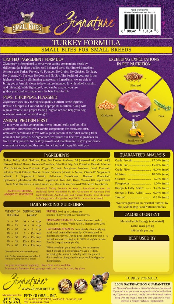 Turkey, Turkey Meal, Chickpeas, Peas, Sunflower Oil (preserved with Citric Acid), Flaxseed, Natural Flavors, Salt, Vitamins (Vitamin A Acetate, Vitamin D3 Supplement, Vitamin E Supplement, Niacin, D-Calcium Pantothenate, Thiamine Mononitrate, Pyridoxine Hydrochloride, Riboflavin Supplement, Folic Acid, Biotin, Vitamin B12 Supplement), Potassium Chloride, Taurine, Minerals (Zinc Proteinate, Iron Proteinate, Copper Proteinate, Cobalt Proteinate, Manganese Proteinate, Calcium Iodate, Sodium Selenite), Mixed Tocopherols Preserved, Choline Chloride, L-Carnitine.Guaranteed Analysis